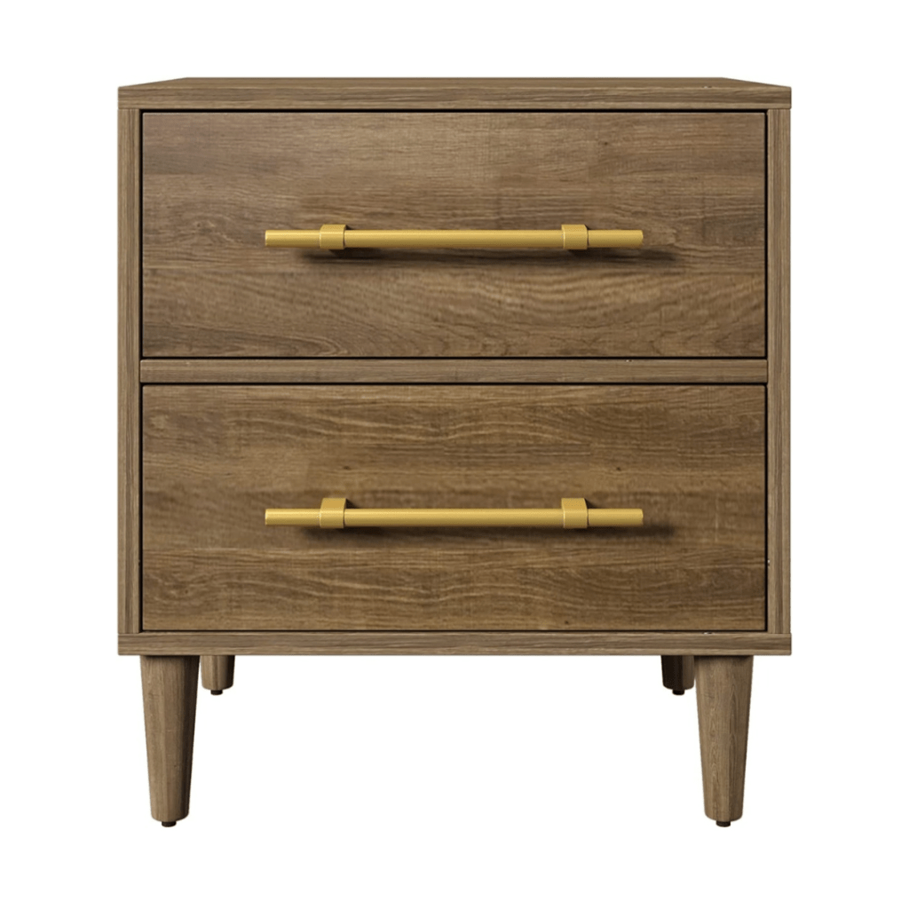 Now let’s talk nightstands: You want something simple and affordable that matches the rest of the room’s decor. Walnut nightstands with drawers and gold drawer pulls will do the trick!