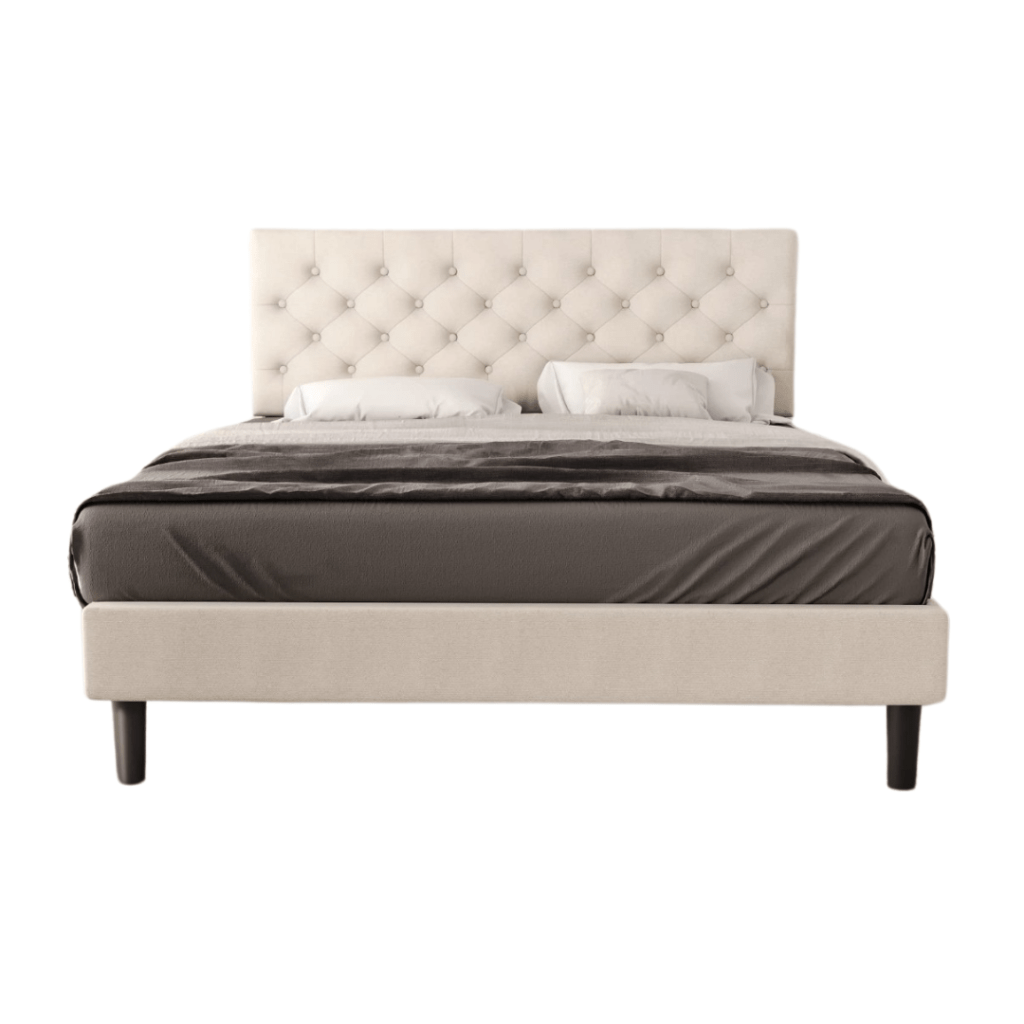 To start, we’re going to focus on the bed—an upholstered linen platform bed with tufted headboard will give you that rustic-meets-modern vibe you’re looking for.