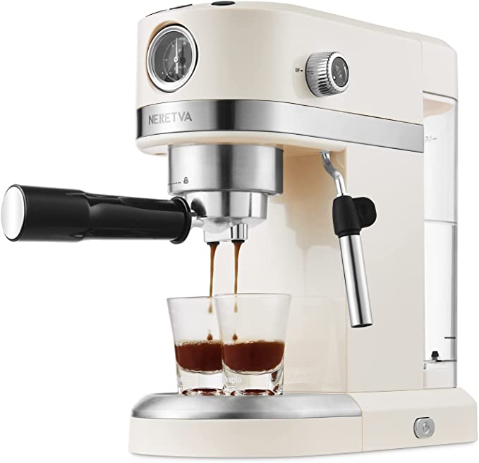 You can brew a cup of espresso, cappuccino, or latte at home with this beautiful cream espresso machine. The hot steam wand produces high quality silky and smooth frothed milk. Its compact design makes it perfect for any kitchen countertop or small space.