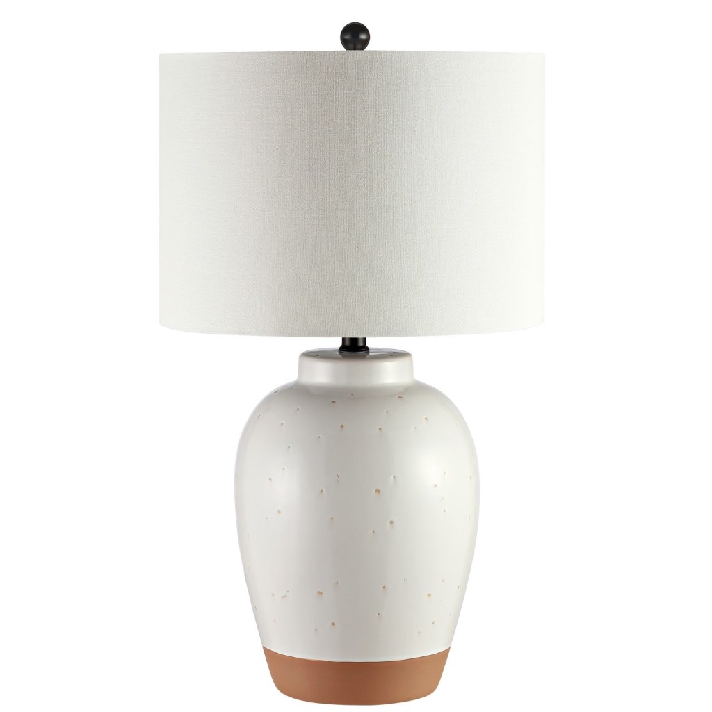 This mid-century table lamp is one of my favorite pieces from the Safavieh collection. It stands 27.5” tall and features a speckled ivory glaze on a clay-toned base, which gives it vintage charm. The white drum shade adds a soft contemporary feel to this piece, while also helping it stand out in any room!